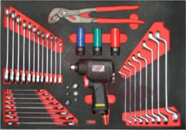 *Naplnený modul obsahuje:* 1 ks pneumatický uťahovák 1/2” mini 1 ks kliešte cobra 300 mm 6 ks sada adaptérov k račňovým kľúčom, bity a hlavice 8 ks kľúč plochý 6x7 - 8x9 - 10x11 - 12x13 - 14x15 - 16x17 - 18x19 - 20x22 8 ks kľúč očko vyhnutý 6x7 - 8x9 - 10x11 - 12x13 - 14x15 - 16x17 - 18x19 - 20x22 12 ks kľúč račňový