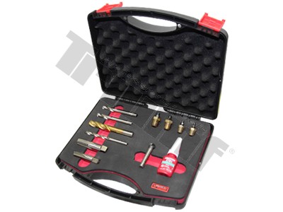 Sada je určená na opravu brzdového strmeňa s odlomenou odvzdušňovacou skrutkou. Pozostáva z vrtákov, frézok, záhlbníka, lepidla a samotných náhradných odvzdušňovacích skrutiek v kombinácii mosadz - železo, ktorá zabraňuje oxidácii a zadretiu skrutky. Dodávané v PVC kufríku s inštrukciami.