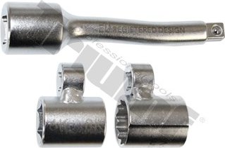 Špecialne tvarovaný prípravok s hlavicou je určený na demontáž do ťažko pristupnych časti, na spodnú stranu vrchnej časti tlmiča. *Sada obsahuje:* -*1 ks* predĺženie 3/8” -*1 ks* hlavica 6-hran / 8-hran -*1 ks* hlavica 12-hran, 14 mm. - Hlavica 6/8-hran vhodná pre vozidlá do r.v. 2015 a 14 mm 12-hran vhodná pre nové