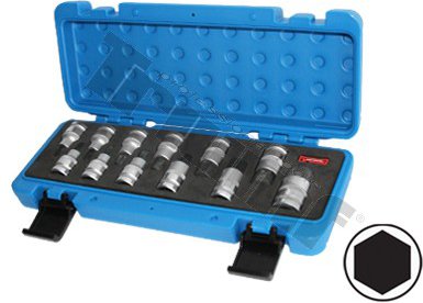 *Materiál:* oceľ S2, hlavice chróm - vanádiová oceľ. *Sada obsahuje:* -*12 ks* nadstavce Inbus 1/2”, dlhé 55 mm: 5 - 6 - 7 - 8 - 9 - 10 - 12 - 14 - 17 - 19 - 22 - 24 mm. Dodávané v plastovej kazete v penovom module