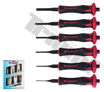Sada profesionálnych vyrážačov extra veľkých priemerov je vyrobená z kalenej ocele zakončená antivibračnou rukoväťou a signalizačným zakončením. *Obsahuje veľkosti:* 2 - 3 - 4 - 5 - 6 - 8 mm. Dodávané v kartónovom obale.