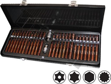 *Materiál*: oceľ S2. *Povrchová úprava*: pomedenie. *Veľkosť drieku:* 10 mm. *Sada obsahuje*: -*14 ks* Inbus bitov, dĺžka 30 mm aj 75 mm 4 - 5 - 6 - 7 - 8 - 10 - 12 mm -*10 ks* XZN ( 1000 - hranných) bitov, dĺžka 30 mm aj 75 mm M5 - M6 - M8 - M10 - M12 -*28 ks* TORX bitov, dĺžka 30 mm aj 75 mm, nevŕtané aj vŕtané