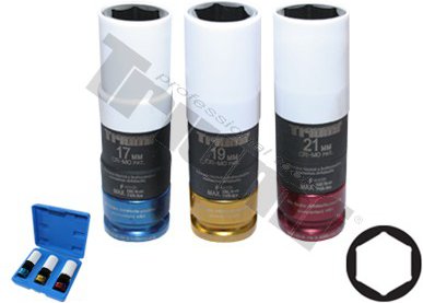 *Materiál:* chróm - molybdénová oceľ. Extra dlhé prevedenie vhodné pre zliatinové disky. Súčasťou hlavice je spojková časť, čo umožňuje použiť túto sadu aj v spojení s elektrickou alebo pneumatickou uťahovačkou. Spojka ruší prenos sily pri dosiahnutí momentu cca 100 Nm, čím sa predchádza poškodeniu závitu náboja