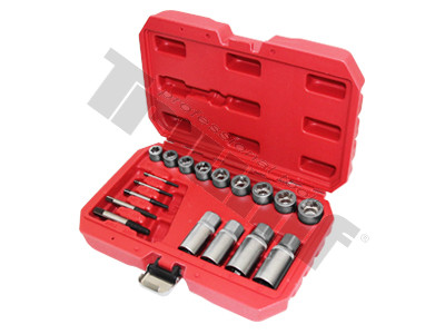 Sada na poškodené matice, 3/8", 10-19 mm, štifty 1/2", 8-12mm, skrutky M3-M18 mm, 18 dielna Určená na demontáž poškodených skrutiek, matíc a štiftov. Inovovaný tvar hlavíc 3/8" na poškodené hrany matíc a skrutiek, doplnený o vyťahováky štiftov a zalomených skrutiek. Sada obsahuje: hlavice: 3/8" - 10, 11, 12, 13, 14,