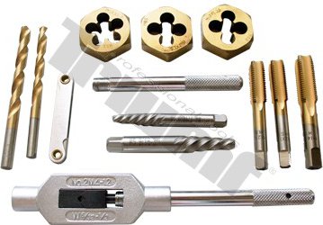 - Sada je určena na opravu zavitov na bubnoch, kotučoch a skrutkach kolies. - Taktiež obsahuje pripravky na vyberanie zalomených skrutiek. *Sada obsahuje:* zavitniky: M12 x 1,25 - M12 x 1,5 - M14 x 1,5, zavitove očka: M12 x 1,25 - M12 x 1,5 - M14 x 1,5, vrtaky: HSS 6,5 - 7,5 mm, vratidlo a zavitove mierky. Dodavane v